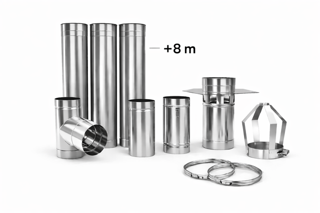 Piperehabilitering 11 meter pakke. Dette er en komplett Ø150mm renoveringsrør pakke med (163mm) koblingsstuss for røykrør i Ø150mm dimensjon.